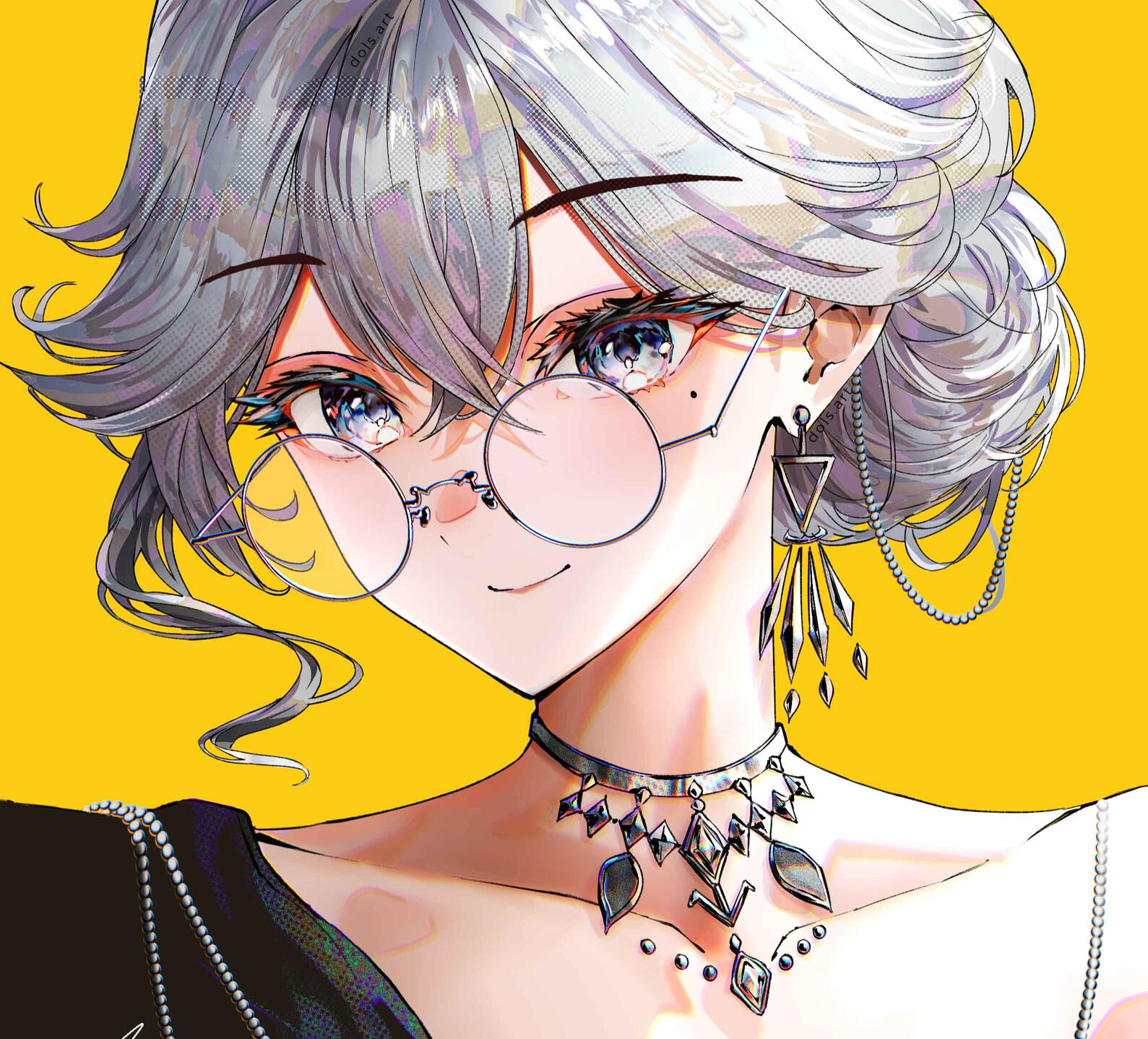 Likes : Tea , Art , Music , Games , DucksDescription : White hair with a long hanging strand on her right with a black stripe along it , Beauty mark under her left eye , dark grey eyes with a hint of blue , Black earring on her left ear and Black necklace. Round glasses .